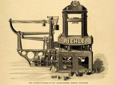 在中國,杠桿式拉伸試驗(yàn)機(jī)被引進(jìn)大概是在上世紀(jì)初,同濟(jì)大學(xué)建設(shè)初期,引進(jìn)一臺(tái)同濟(jì)編號為:440001的杠桿式拉伸試驗(yàn)機(jī)(圖二),目前,存放于同濟(jì)大學(xué)力學(xué)試驗(yàn)中心。這臺(tái)試驗(yàn)機(jī)上同時(shí)標(biāo)有“RIEHLE BRCXPHILA16494”(圖三)的小字,通過檢索,發(fā)現(xiàn)這臺(tái)試驗(yàn)機(jī)是由位于美國費(fèi)城的理勒兄弟測試機(jī)械公司(Riehle Brothers Testing machines Company)生產(chǎn)。